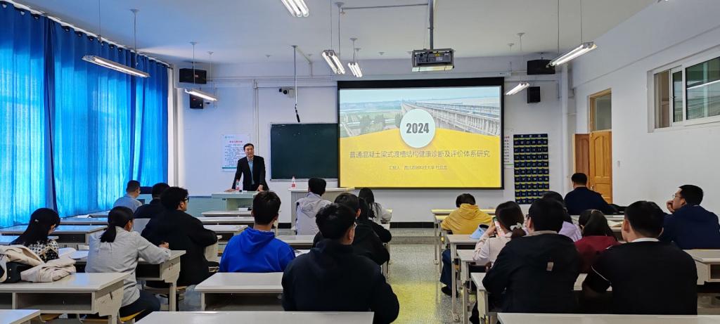 聚焦梁式渡槽结构健康诊断及评价体系的研究领域,特别是确定渡槽结构的安全评价内容、评价标准和参数、加固措施等关键科学技术问题,杜教授凭其深厚的专业知识和独到的见解,进行了精彩深入的讲解,并结合自己的研究领域,分享了结构健康诊断技术方面的国际前沿科研动态和创新思路,激发了师生们的思考和兴趣。
