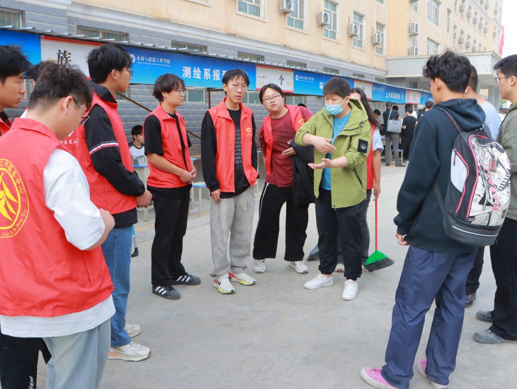 已整装待发、迎接新生。百余名水建志愿者统一身着赤焰马甲,以昂扬之姿、火热之心欢迎远道而来的小萌新们。