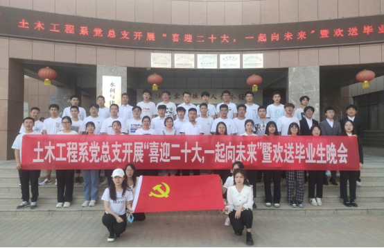 为进一步加强基层党组织建设,同时表达对毕业生的美好祝福,丰富校园文化生活。6月5日晚,土木工程系党总支在工科实训楼南513开展“喜迎二十大,一起向未来”暨毕业生欢送会,土木工程系党总支书记王荣、学生第一党支部书记孟旭波、学生第一党支部副书记刘雨涵及学生代表参加。