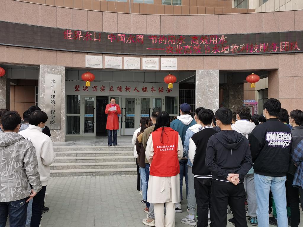 3月22日,团队成员组织学生,在综合楼及2号教学楼门口,发放中国水利学会“世界水日·中国水周”科普活动宣传册,向广大师生宣传“护好大水,喝好小水”的科普知识12问,普及水资源各个方面的相关知识。在网上发起“世界水日·中国水周”及“护好大水,喝好小水”知识竞赛,共收到229份有效答卷,产生一等奖1名,二等奖3名,三等奖8名,由团队成员李林为获奖同学发奖。26日,团队成员在管瑶老师的带领下,组织学生在工科实训楼进行高效用水,节约用水宣讲活动。通过宣讲,让同学们树立起“节水优先,空间均衡,系统治理,两手发力“的新时代治水理念,在以后的学习、工作过程中,将节水意识和保护水资源落到实处。