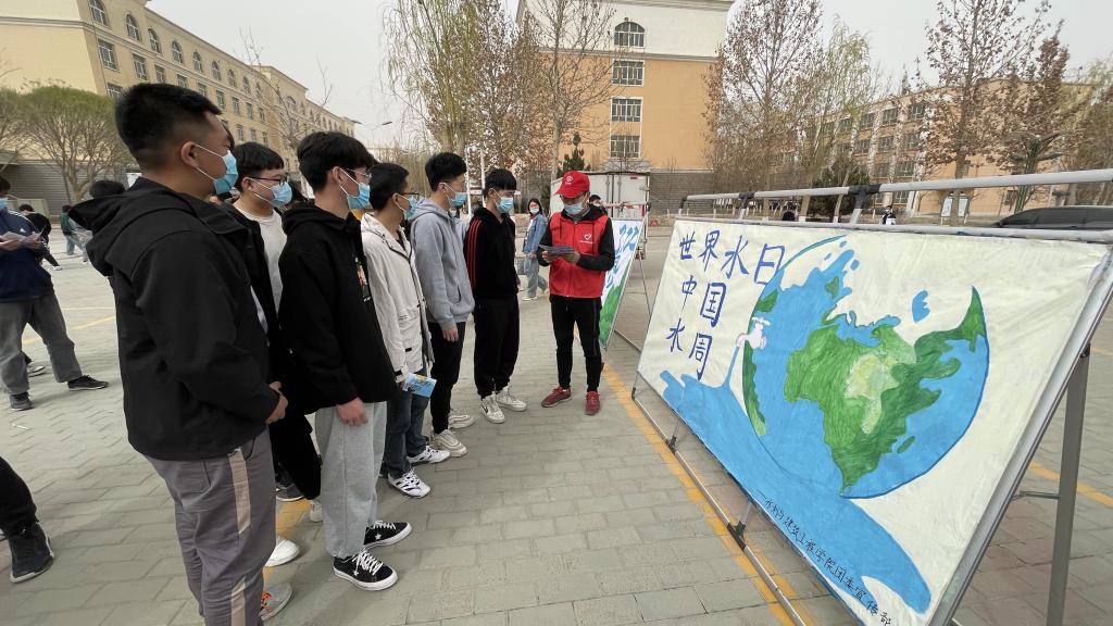 农业高效节水增收科技服务团队在西区第四食堂门口开展了以“珍惜水 爱护水”、“深入贯彻新发展理念,推进水资源集约安全利用”为主题的宣传活动。