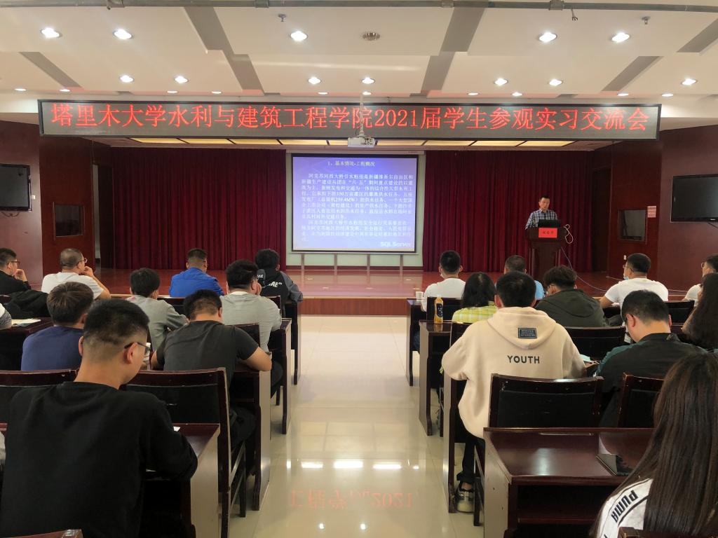 按照教学计划,农水21届毕业实习从7月20日至7月31日进行,分四部分:第一部分,校内实习,由指导教师选取阿克苏地区典型水利枢纽—塔里木引水枢纽除险加固工程(由阿克苏地区水利水电勘测设计院有限公司张菊梅总工主设)及阿克苏河西大桥引水枢纽除险加固工程(由新疆宏图工程勘测设计有限公司傅晓松总经理主设)作为工程案例,以工程设计图纸进行讲解,让学生根据图纸计算工程量,以达到看懂图,熟悉工程图纸的目的。第二部分,带领学生到工程现场,对标设计图纸,仔细核对水利枢纽的组成部分以及图纸和实物之间的关系,进一步深化从图纸到工程的认识。第三部分,由工程的主设人员讲解水利枢纽除险加固设计的背景、目的及意义,每一个水工建筑物如何进行设计,设计过程中需要注意的具体问题,经过多年的运行管理,回过头来看设计过程中存在哪些经验和教训,以及分享在设计过程中针对塔里木河治理总结出来的工程经验。第四部分,带领学生参观大石峡水利枢纽。葛洲坝大石峡水利枢纽有限公司的黄晋书记,欧阳兵总经理,综合部李相丞部长及大石峡建管局任艳副局长等领导百忙之中抽出宝贵时间,到现场迎接我们并在观景台给同学们介绍了工程相关情况,还为我们拉了诠释学校育人精髓——“艰苦奋斗,自强不息,扎根边疆,甘于奉献”的胡杨精神的横幅,让我们深受感动的同时精神为之振奋。黄书记说要把我校宝贵的胡杨精神扎根在葛洲坝大石峡水利枢纽建设工地,铸就优良工程,为新疆的发展建设做出贡献;而后,又在新落成的办公楼会议厅为我们播放了大石峡水利枢纽的宣传视频,进一步加深了同学们对大石峡水利枢纽的认识。