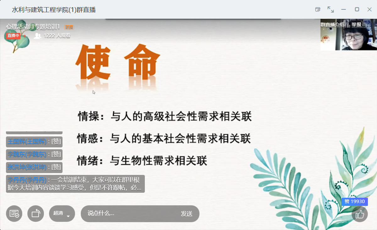 于5月19日晚21:30,通过钉钉直播开展了心理活动月专题培训。此次培训由辅导员李丹丹主讲,学院1236人参加了此次培训。