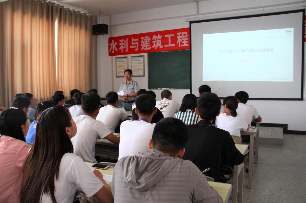 学生干部的思想政治素质和业务水平,以便更好地为广大师生服务。水建院于5月29日下午,在工科实训大楼南513教室举办团学干部培训班。学院党委副书记李新、辅导员李丹丹、李飞、艾合塔木出席了本次活动。