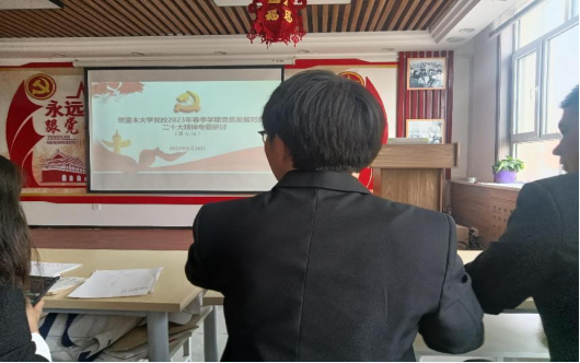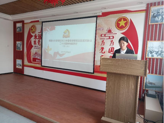 本次会议由唐浩同志主持。会议上,发展对象通过观看党的二十大有关视频学习巩固了党的性质、指导思想和宗旨相关知识,并对三件大事进行回顾,了解明白新时代党的中心任务,并且各党支部派分别代表分享研讨心得体会。其中环境与工程系学生党支部由张世月同志分享心得体会时,她提到:“当代大学生应该树立远大的理想和抱负,将人生理想融入国家和民族的事业中,在不懈奋斗中实现自己的人生价值。正如习近平总书记所指出的:‘青年一代有理想、有本领、有担当,国家就有前途,民族就有希望’。