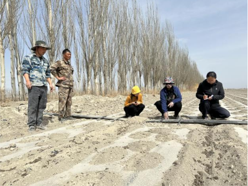 在北大渠乡北大渠村,管瑶教授对种植棉花铺设的滴灌带连接情况及滴头流量进行现场指导,以形成科学、高效的种植灌溉模式。