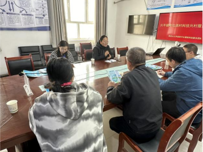 在尉犁县兴平镇哈拉洪村,与技术工作人员进行座谈交流。针对研究当地苦咸水的利用团队成员与技术人员进行讨论,同时还为当地农民发放了科学用水宣传手册。