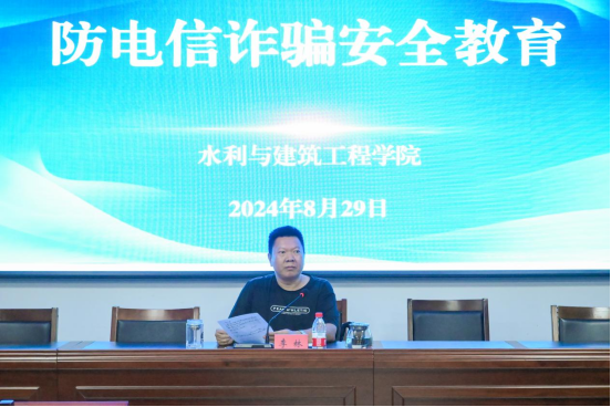 在工科实训楼一号会议室召开了电信反诈宣传会议。此次活动旨在增强师生防范电信网络诈骗的意识与能力,构建安全和谐的校园环境。会议由水建院党委副书记李林主讲,全体班主任参加。