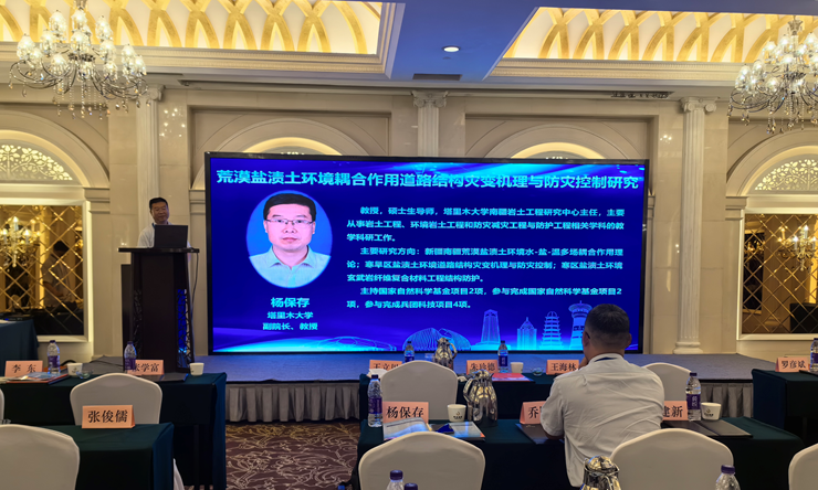 在严酷环境隧道工程建设分会场,杨保存教授作了题为《荒漠盐渍土环境耦合作用道路结构损伤机理与防灾控制研究》的专题报告。报告主要介绍了新疆南疆区域特殊的环境作用问题及引发道路工程灾害的科学问题,着重介绍了运用团队自主研发的荒漠盐渍土环境“水-盐-温多场耦合试验系统”开展道路结构损伤机理相关研究工作,针对南疆盐渍土环境道路工程盐胀-冻胀灾害问题提出了道路结构防灾设计方案与灾害控制方法。